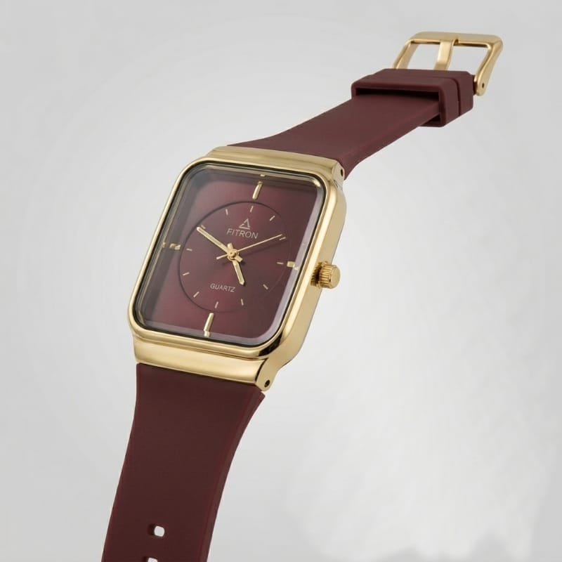 The watch has a polished gold square case and a maroon circular dial displaying the brand “FITRON” in white letters with a triangular logo above it. The word “QUARTZ” is printed at the bottom of the dial. Gold rectangular hour markers are placed at 3, 6, 9, with white line markers in between. The dial uses gold hands for timekeeping. The watch is fitted with a maroon leather strap and a gold buckle, giving it a stylish, modern appearance suitable for everyday wear.