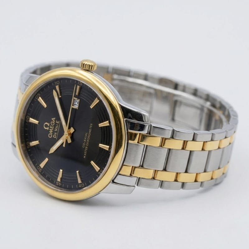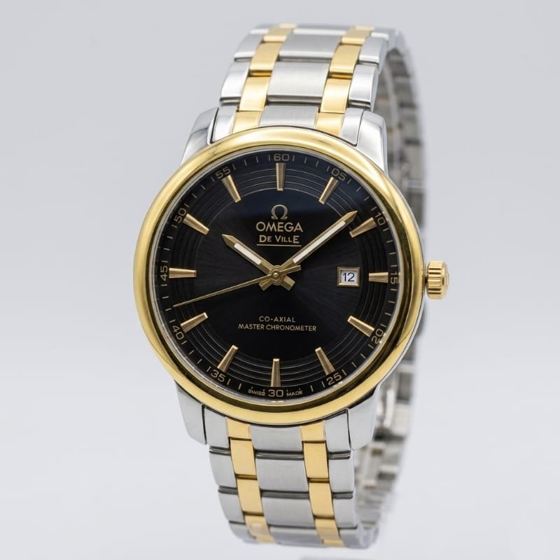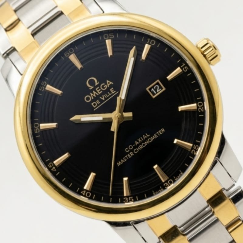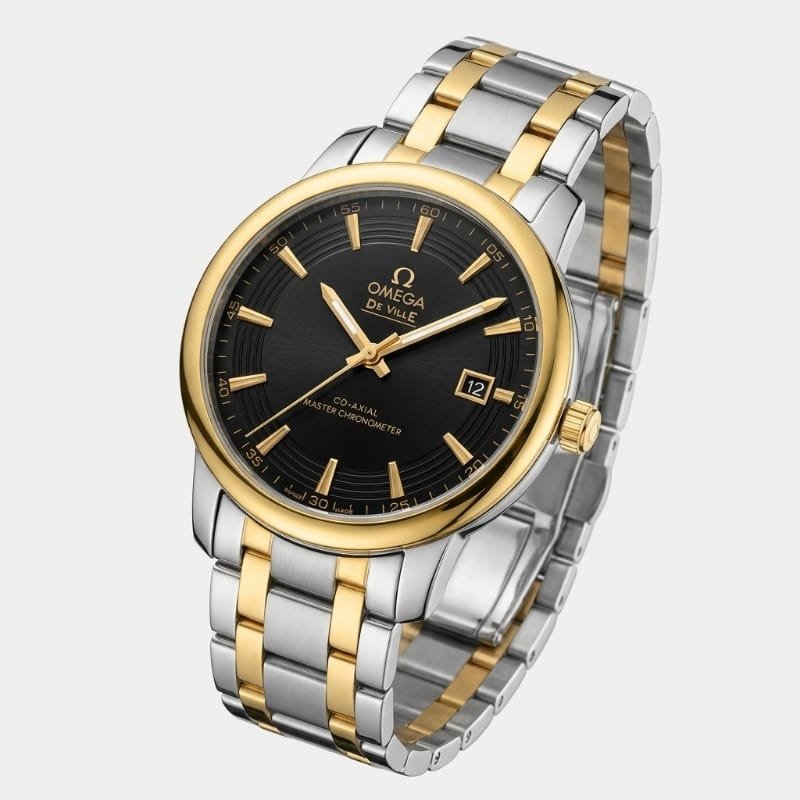 Elevate your style with the timeless elegance of the Omega De Ville Co-Axial Master Chronometer. Featuring a striking black dial with gold-tone accents and a premium two-tone stainless steel bracelet, this timepiece perfectly blends classic heritage with modern precision. Ideal for formal wear and professional settings.