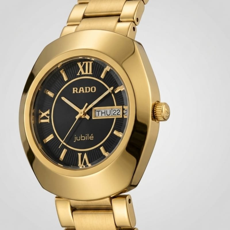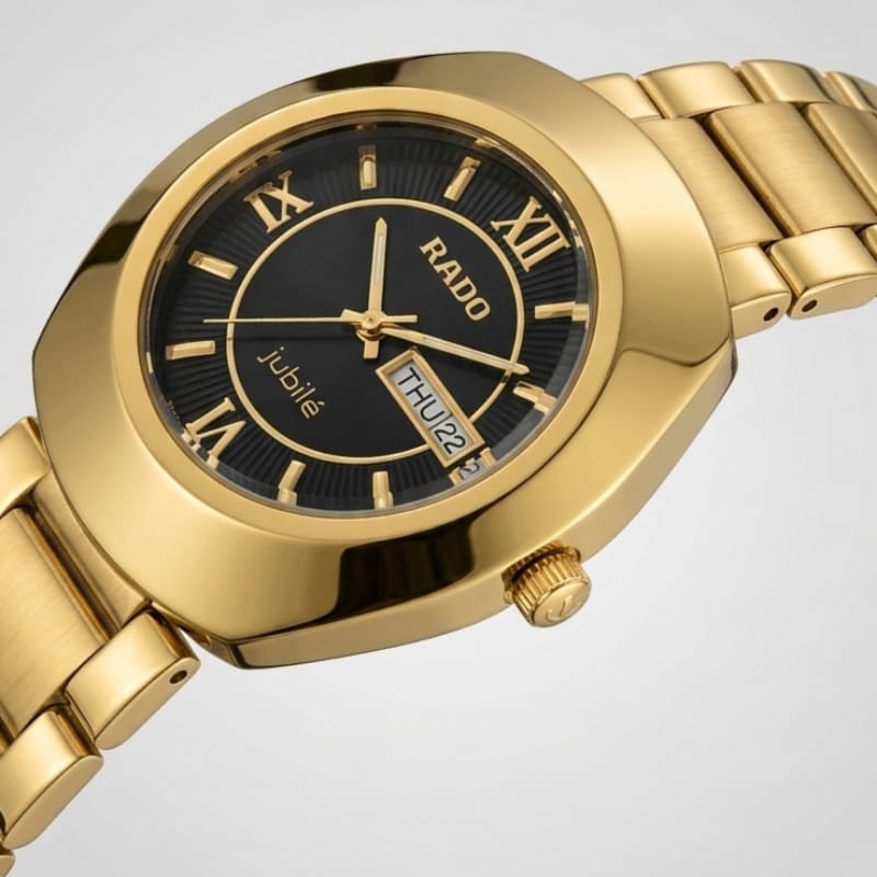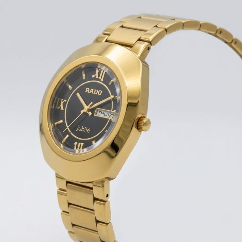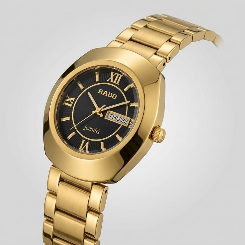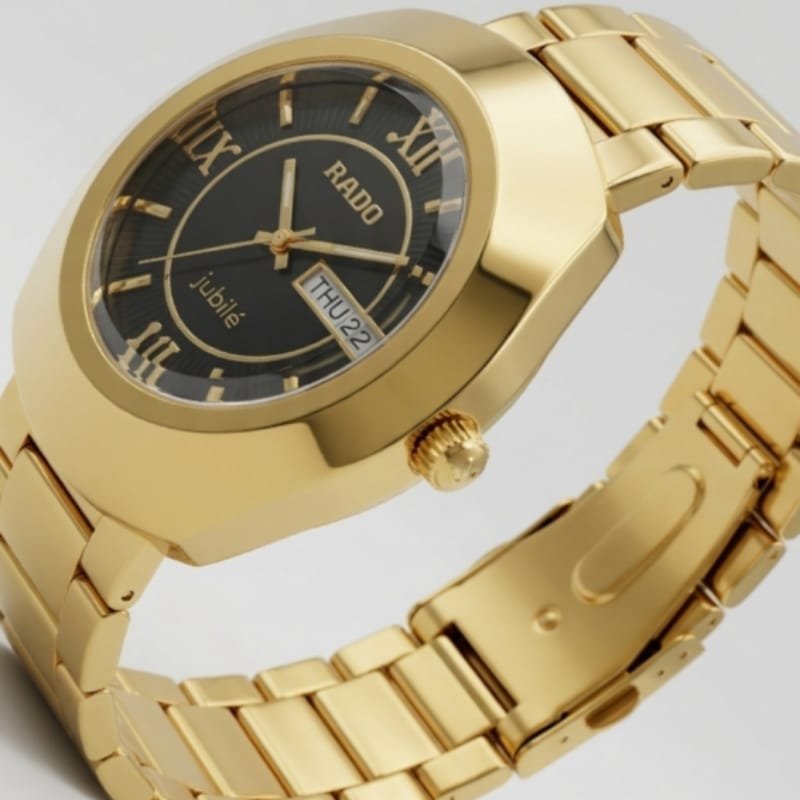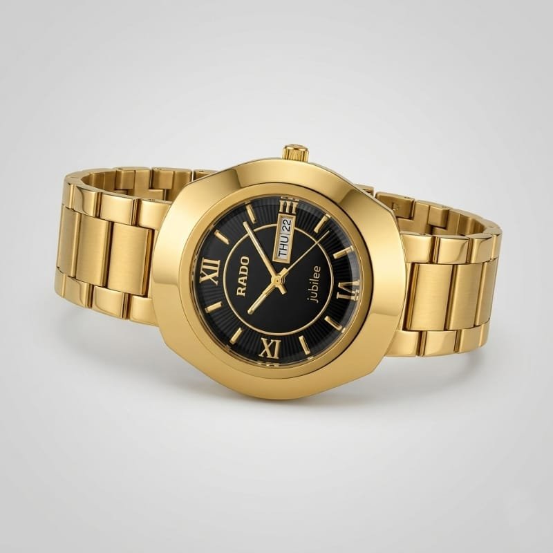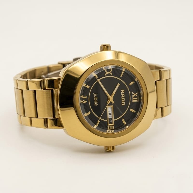 he Rado Jubilé is a gold-plated watch featuring a black dial with gold Roman numeral hour markers and gold hands. and the brand name “RADO” at the top with “Jubilé” inscribed at the bottom. The watch has a gold bezel and metal bracelet with a classic, elegant design.
